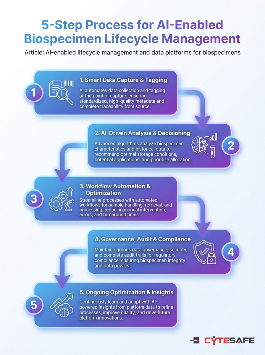 Five-step AI-driven workflow for biospecimen lifecycle management. It shows how data platforms support each stage from collection to disposal.