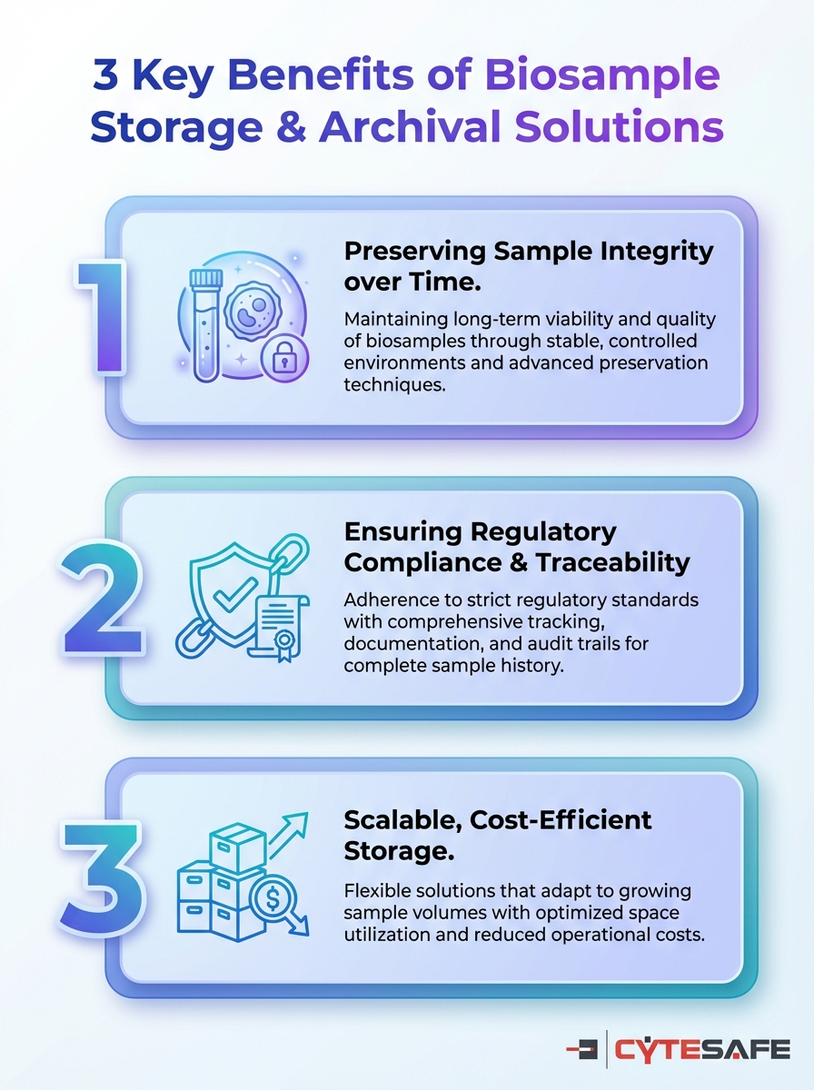 This infographic highlights three key benefits of biosample storage and archival solutions for labs. It helps researchers compare options for preservation and access.